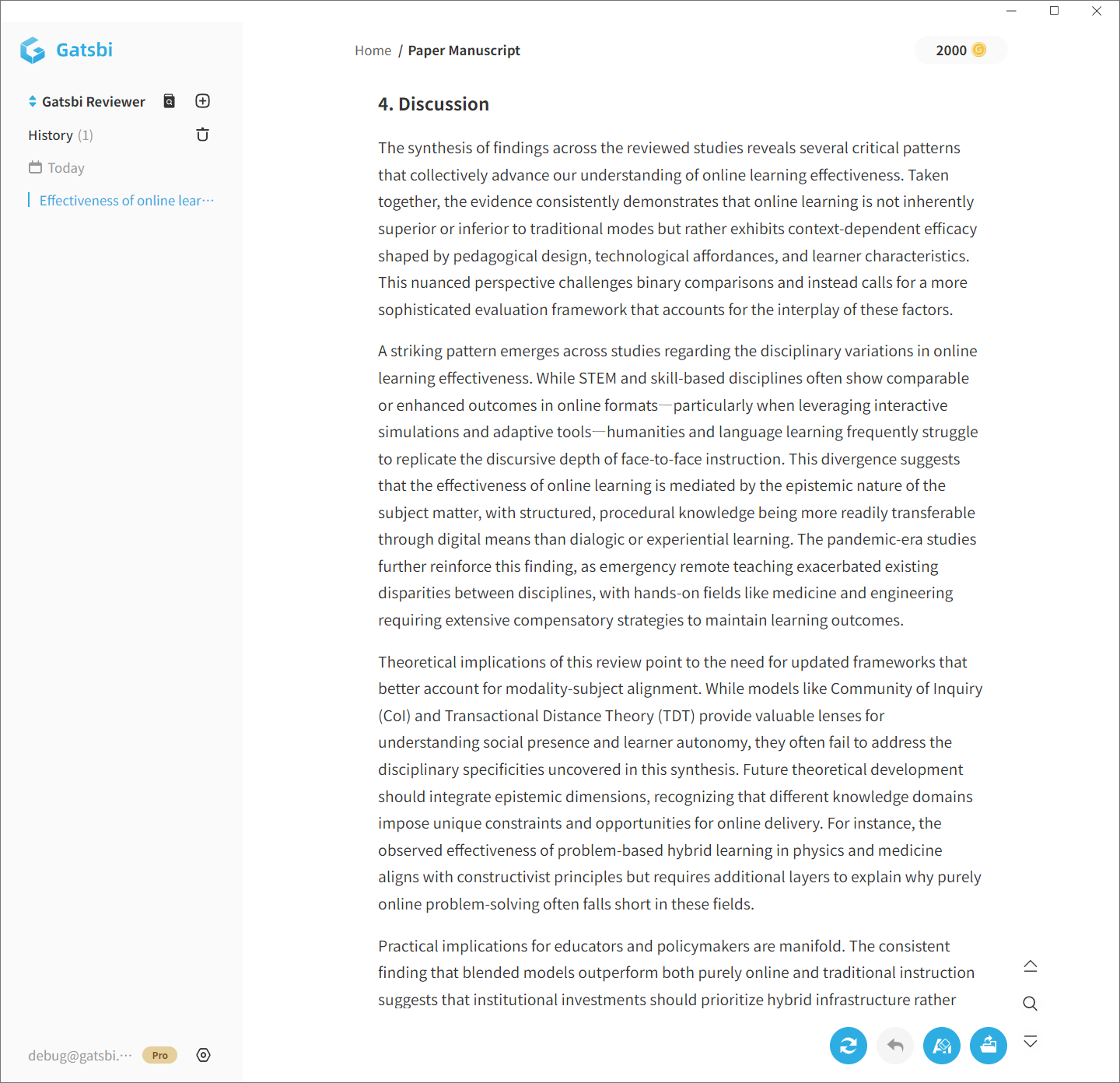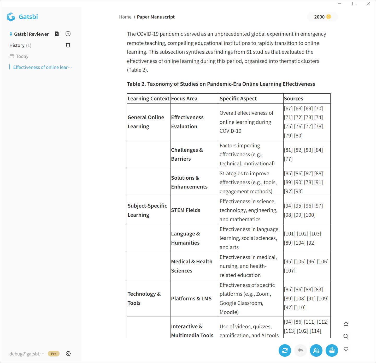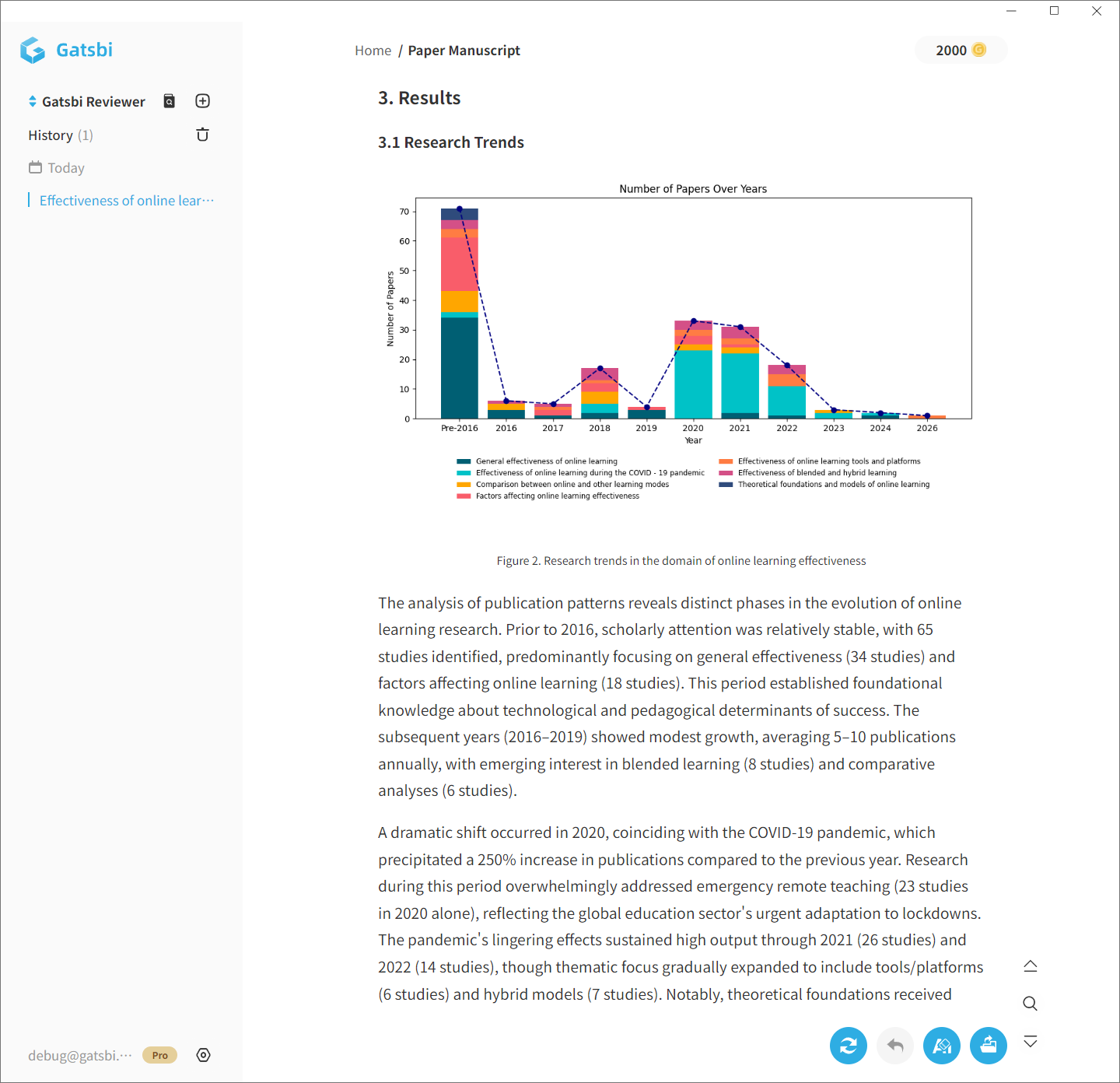 Writing starts immediately. Gatsbi will synthesize findings, generate thematic summaries, and create a structured draft—all in minutes.