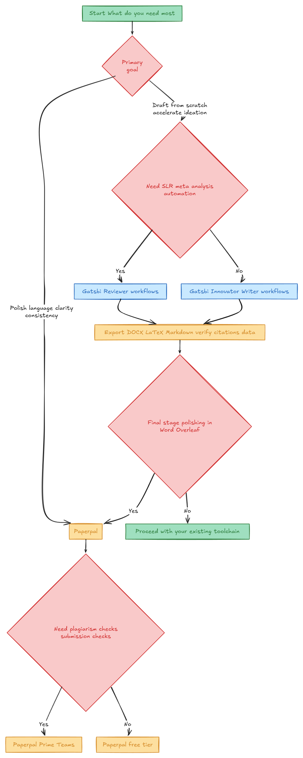 When you might use both A common pattern is: use Gatsbi for ideation and a structured first draft (especially for outlines, literature review scaffolding, and synthesis organization), then move the manuscript into Paperpal inside Word/Overleaf for line-level language refinement, consistency, plagiarism checks, and submission readiness. This “draft → polish → comply” workflow matches each tool’s published strengths (generation breadth vs. in-editor editing/compliance).