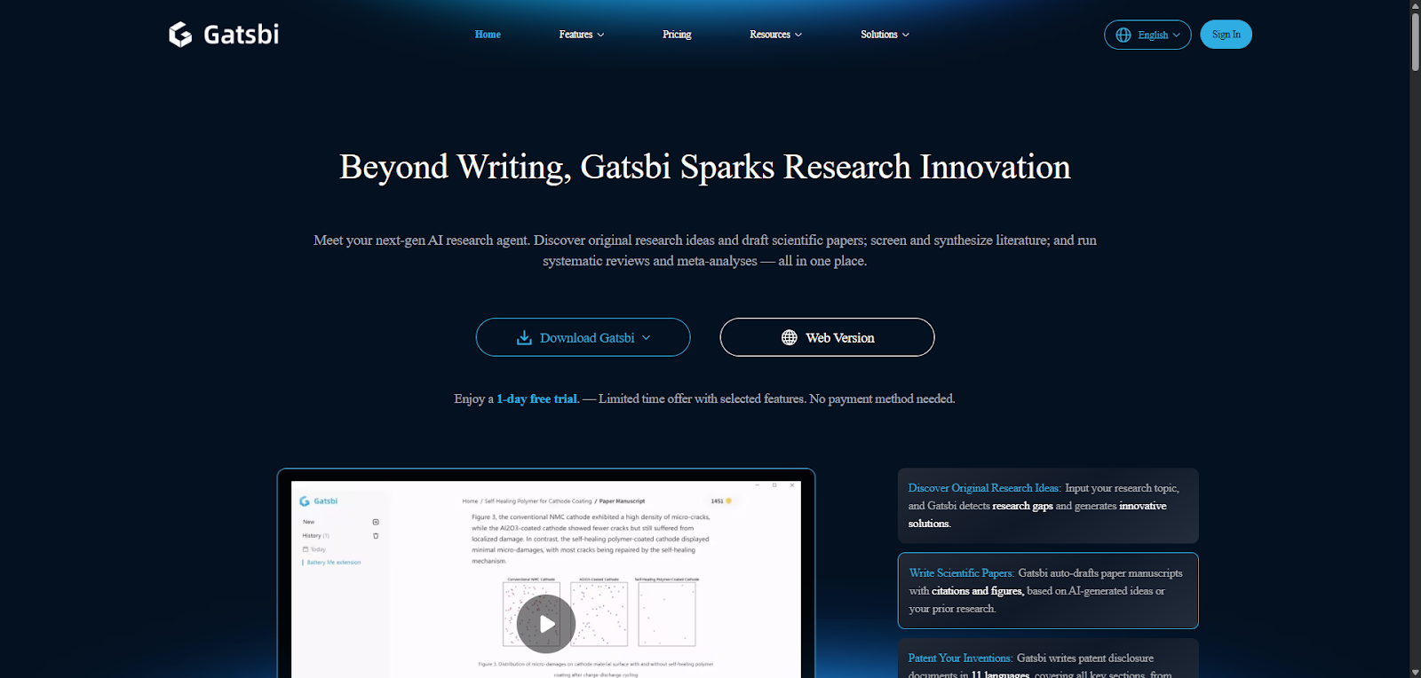 Gatsbi is a platform that leverages artificial intelligence (AI) to assist with academic writing, research conceptualization, and patent documentation. Fundamentally, Gatsbi enables users—such as researchers, academics, and innovators—to input a subject or area of interest, and it subsequently generates a diverse array of original research ideas.